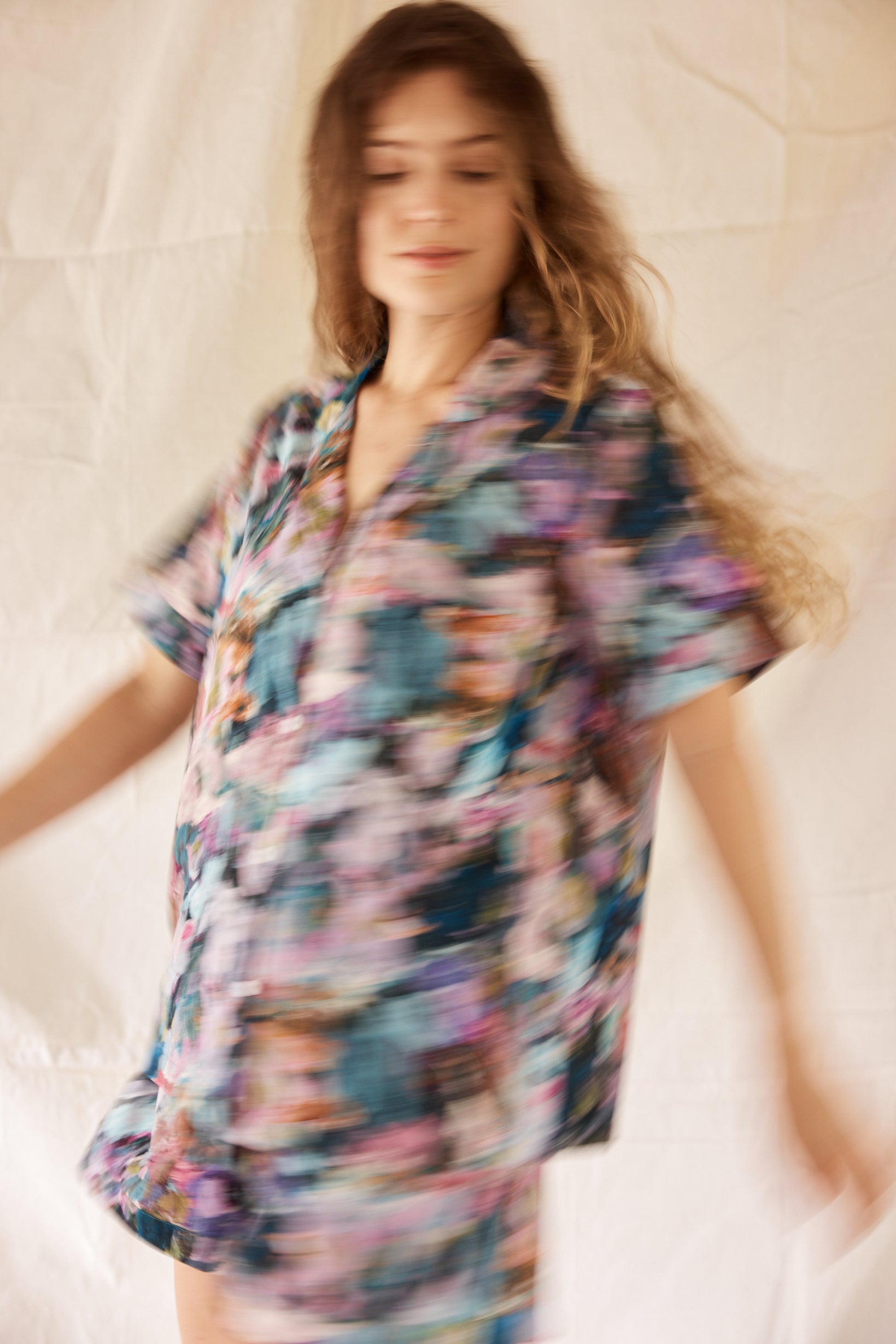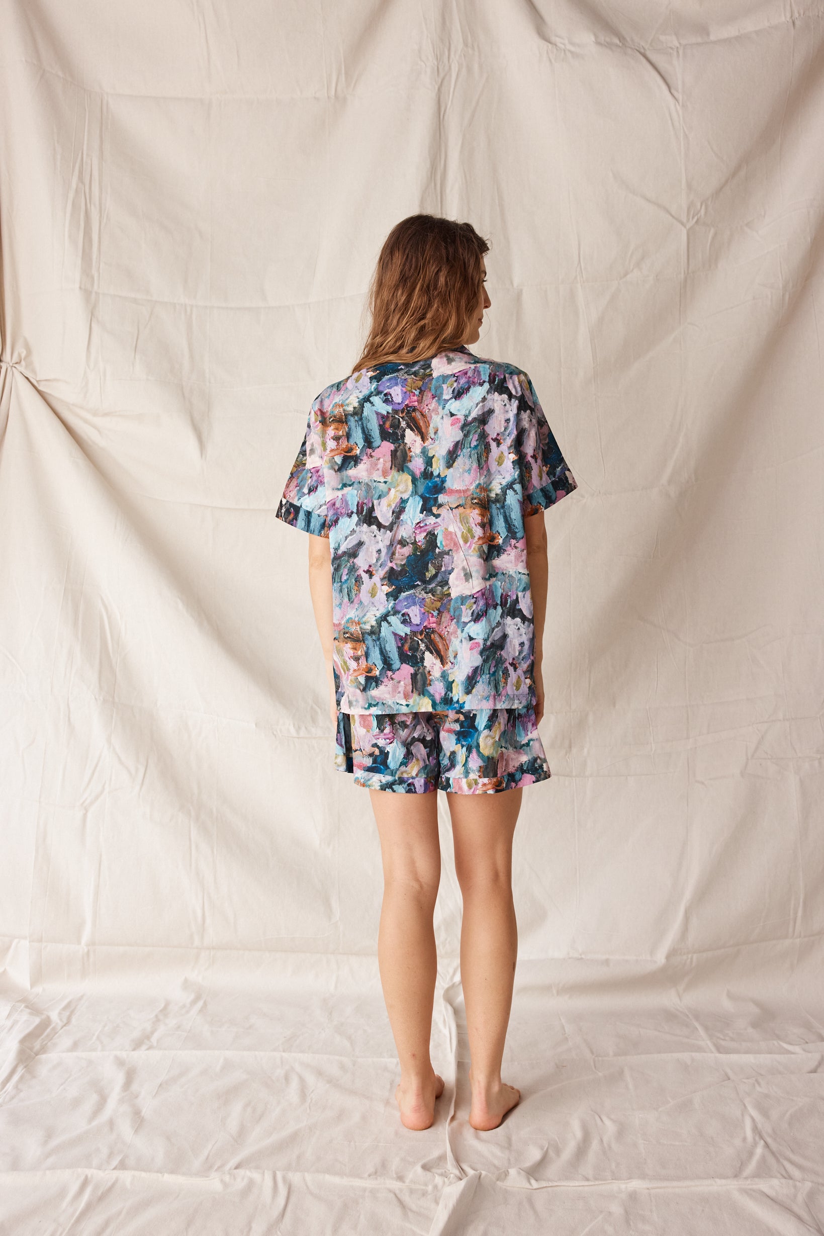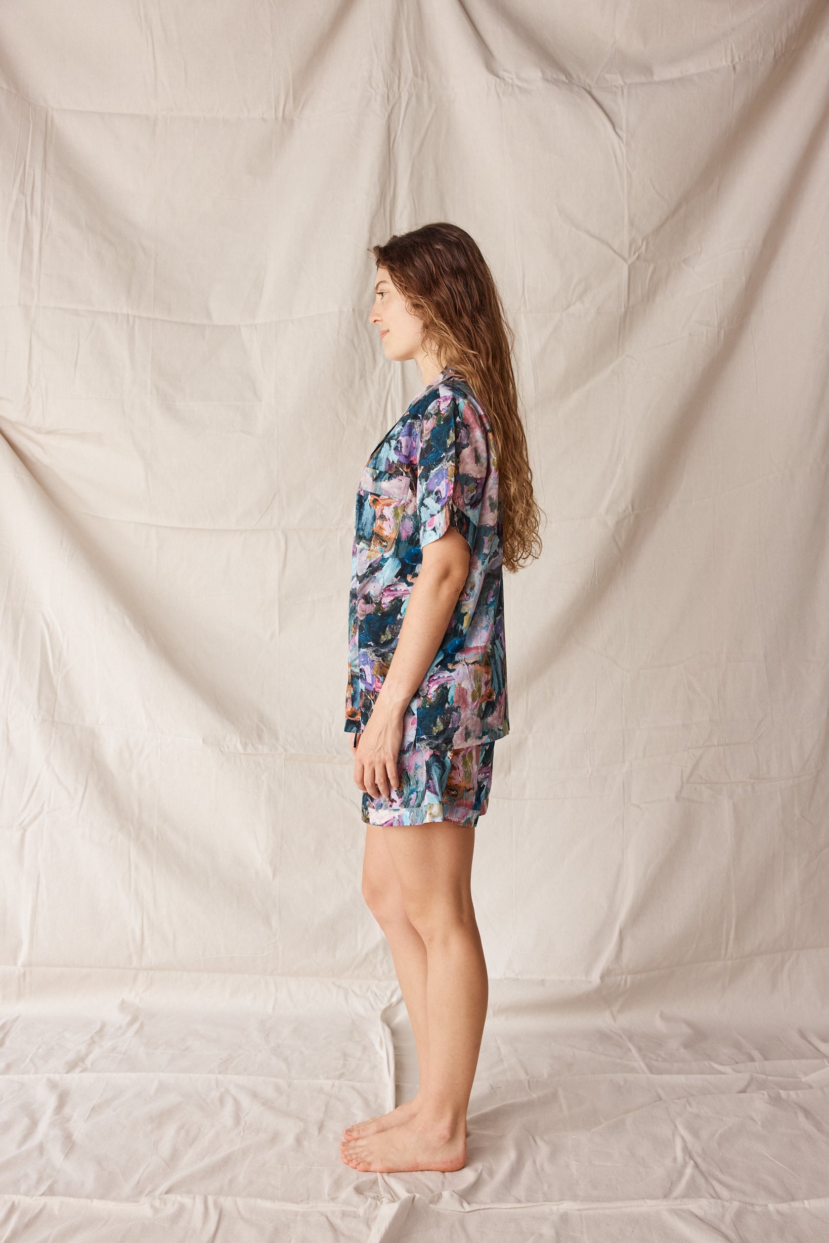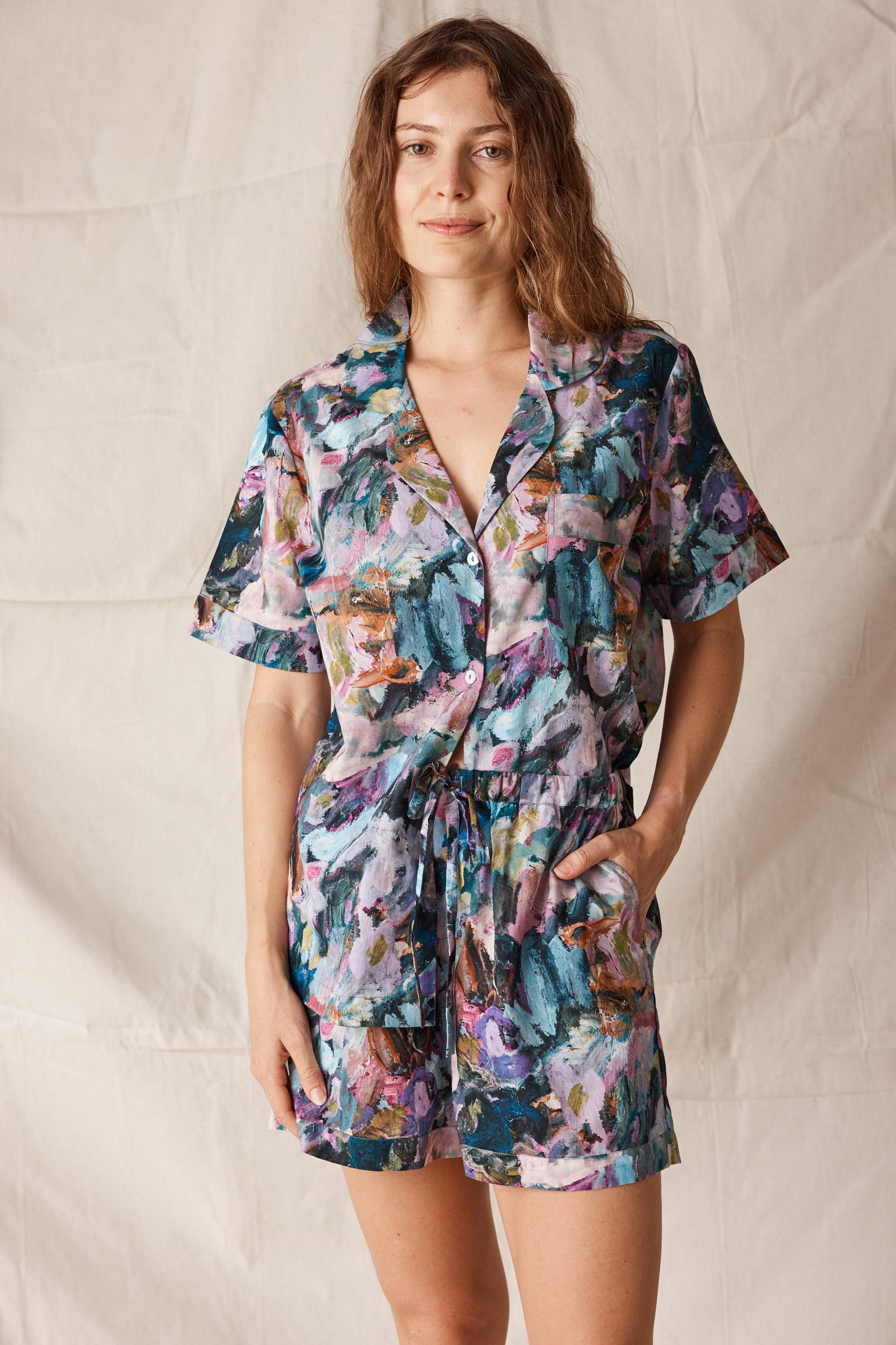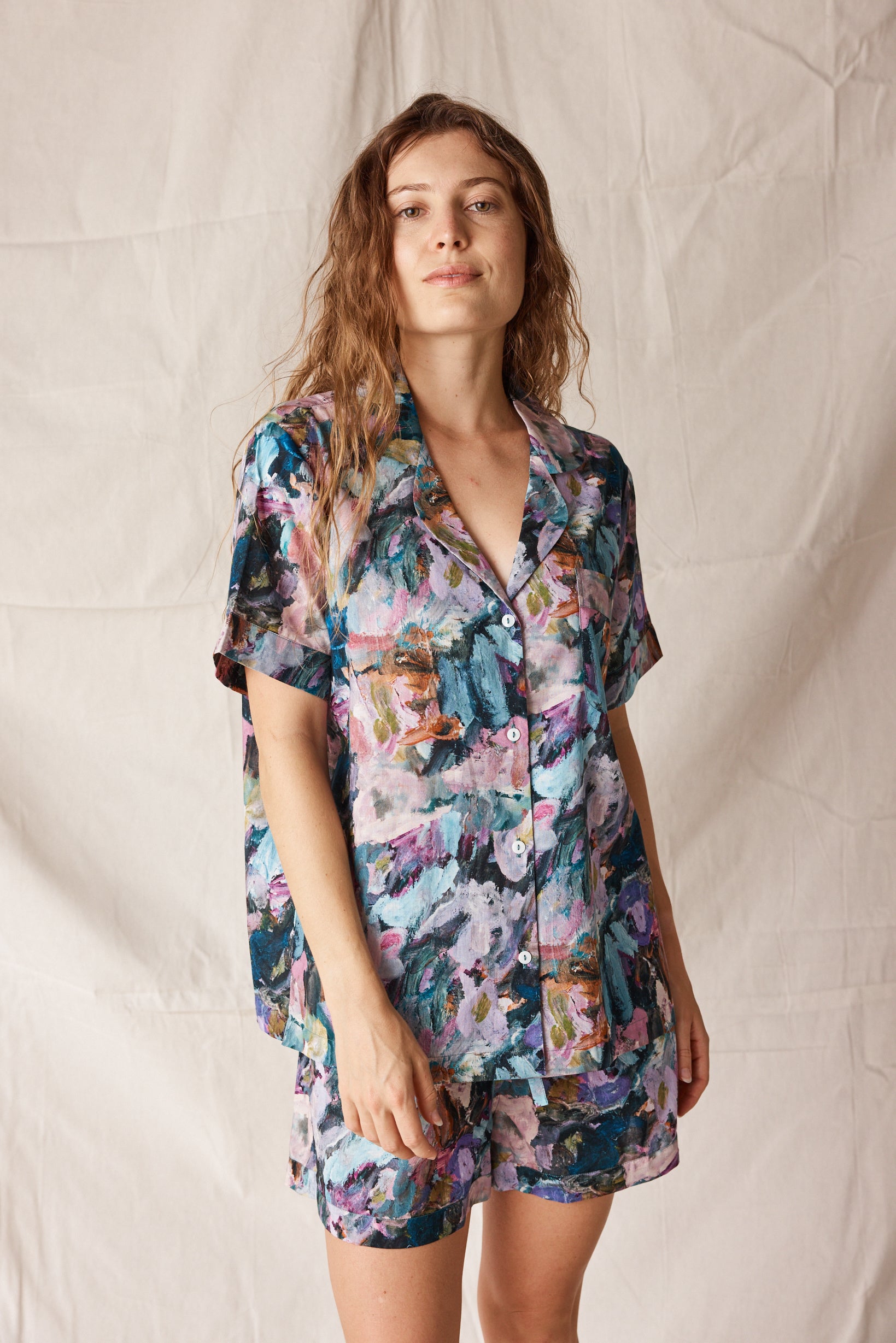 The Short Sleep Set in Wildflower blends comfort with creativity - a relaxed short-sleeve button-up and matching drawstring shorts crafted from lightweight, breathable cotton. The exclusive Wildflower print, taken from an original artwork by Adele Bevacqua, capturing colour with an artists eye.