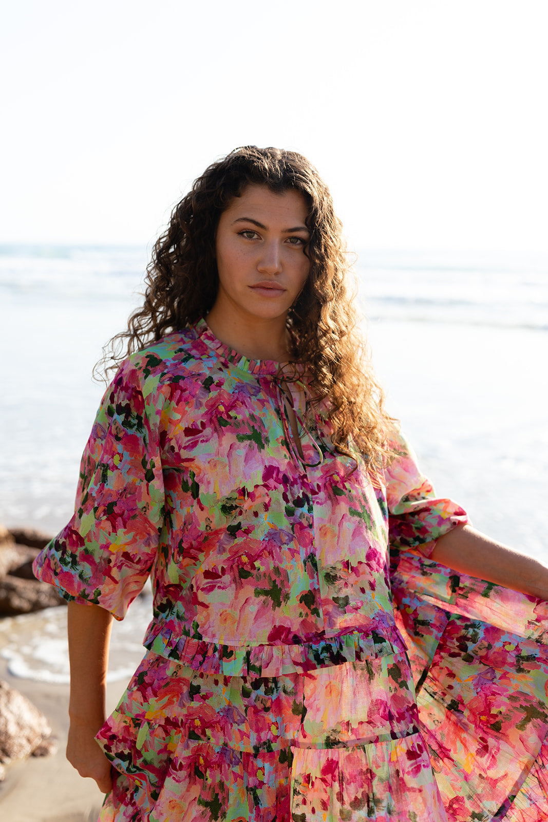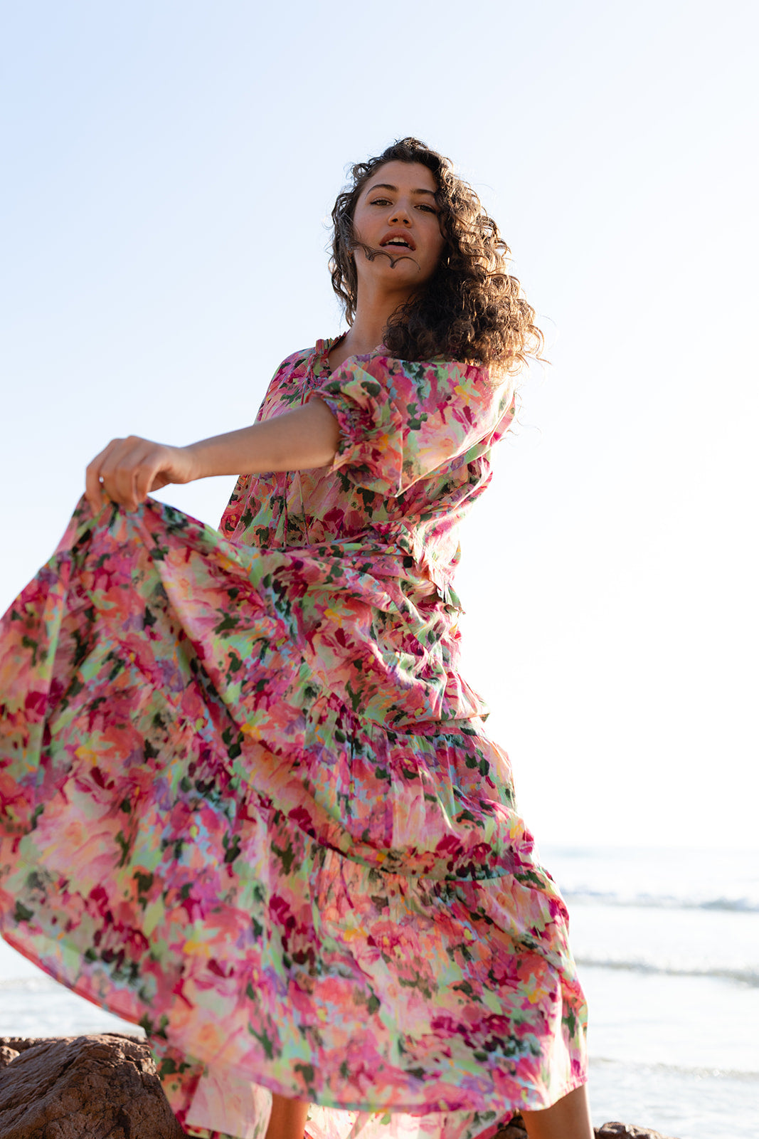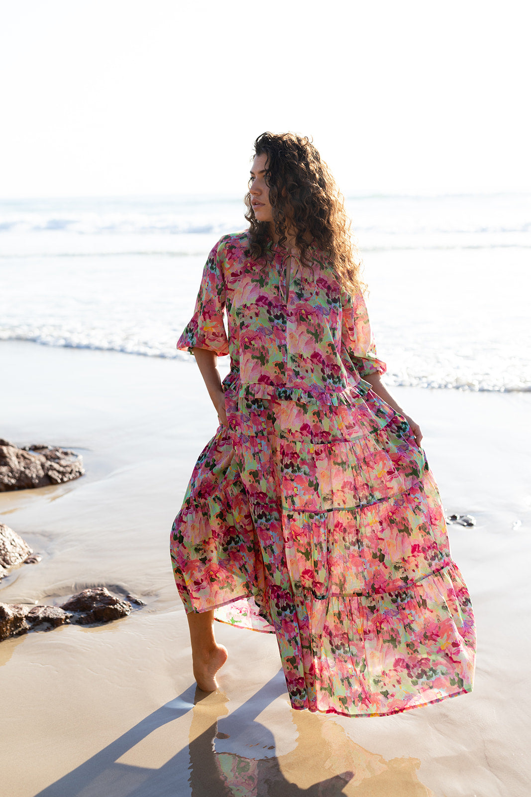 This flattering maxi dress is made from a soft breathable cotton. Designed with the female silhouette in mind, it features a ruffle at the waist, an optional tie at the top that can be left undone, and a tiered skirt. It features our exclusive "Mila" print, painted by our founder Adele Bevacqua.