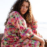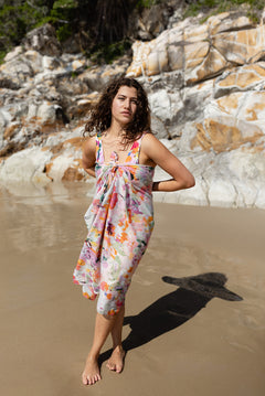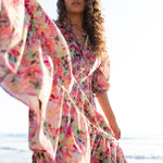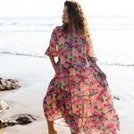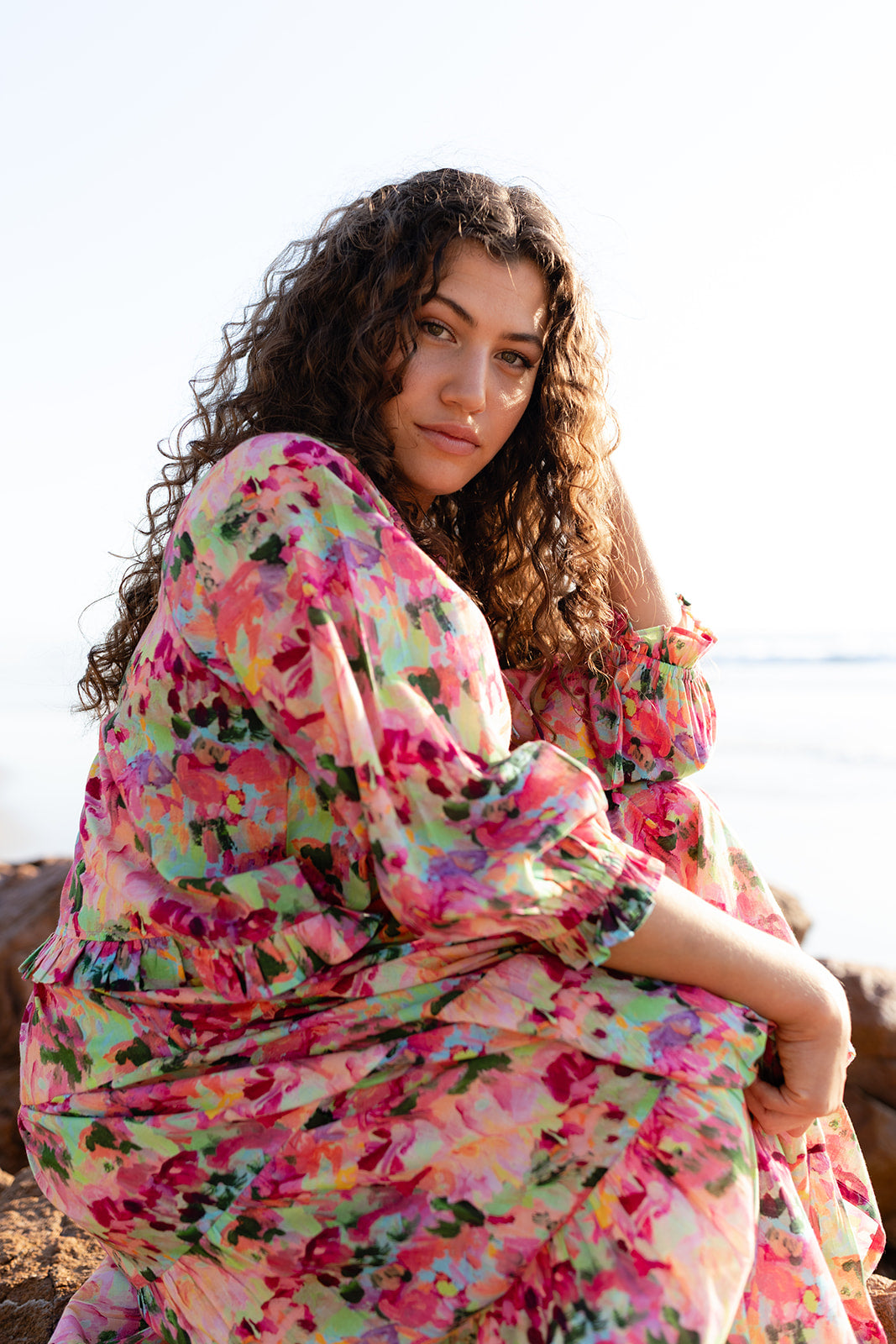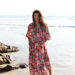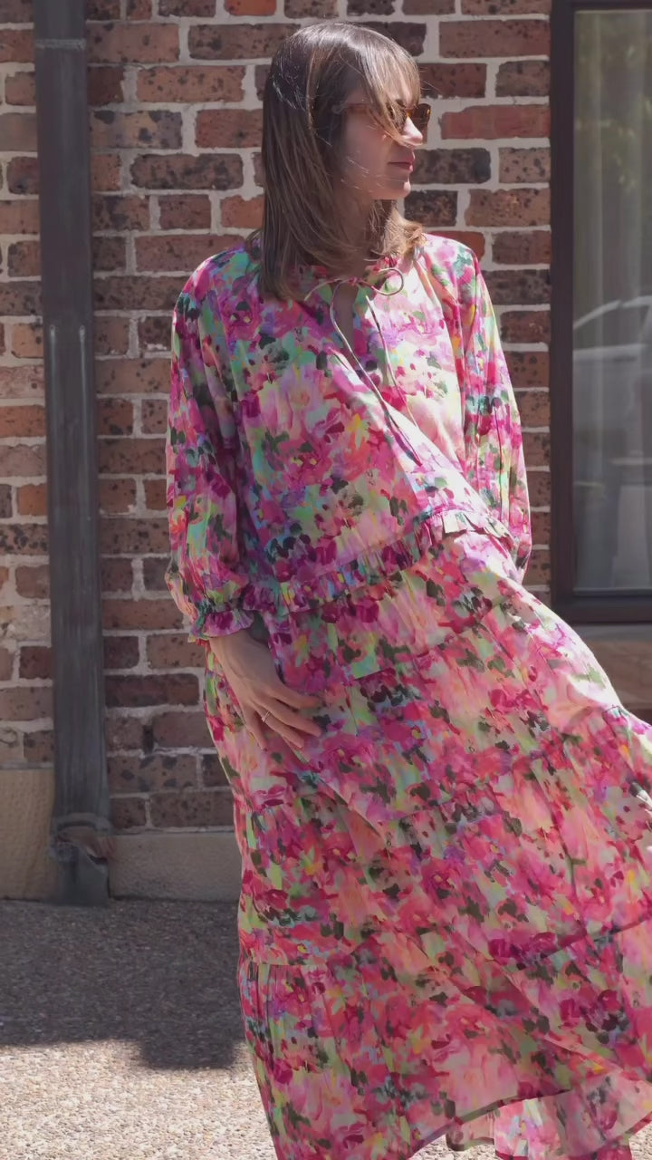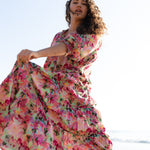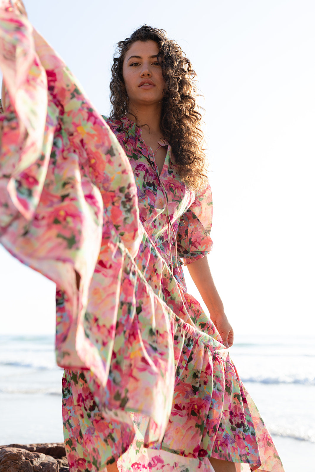 This flattering maxi dress is made from a soft breathable cotton. Designed with the female silhouette in mind, it features a ruffle at the waist, an optional tie at the top that can be left undone, and a tiered skirt. It features our exclusive "Mila" print, painted by our founder Adele Bevacqua.