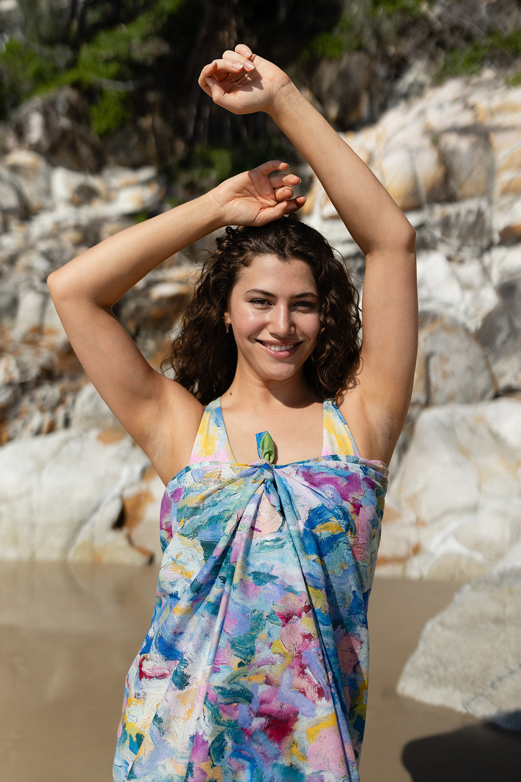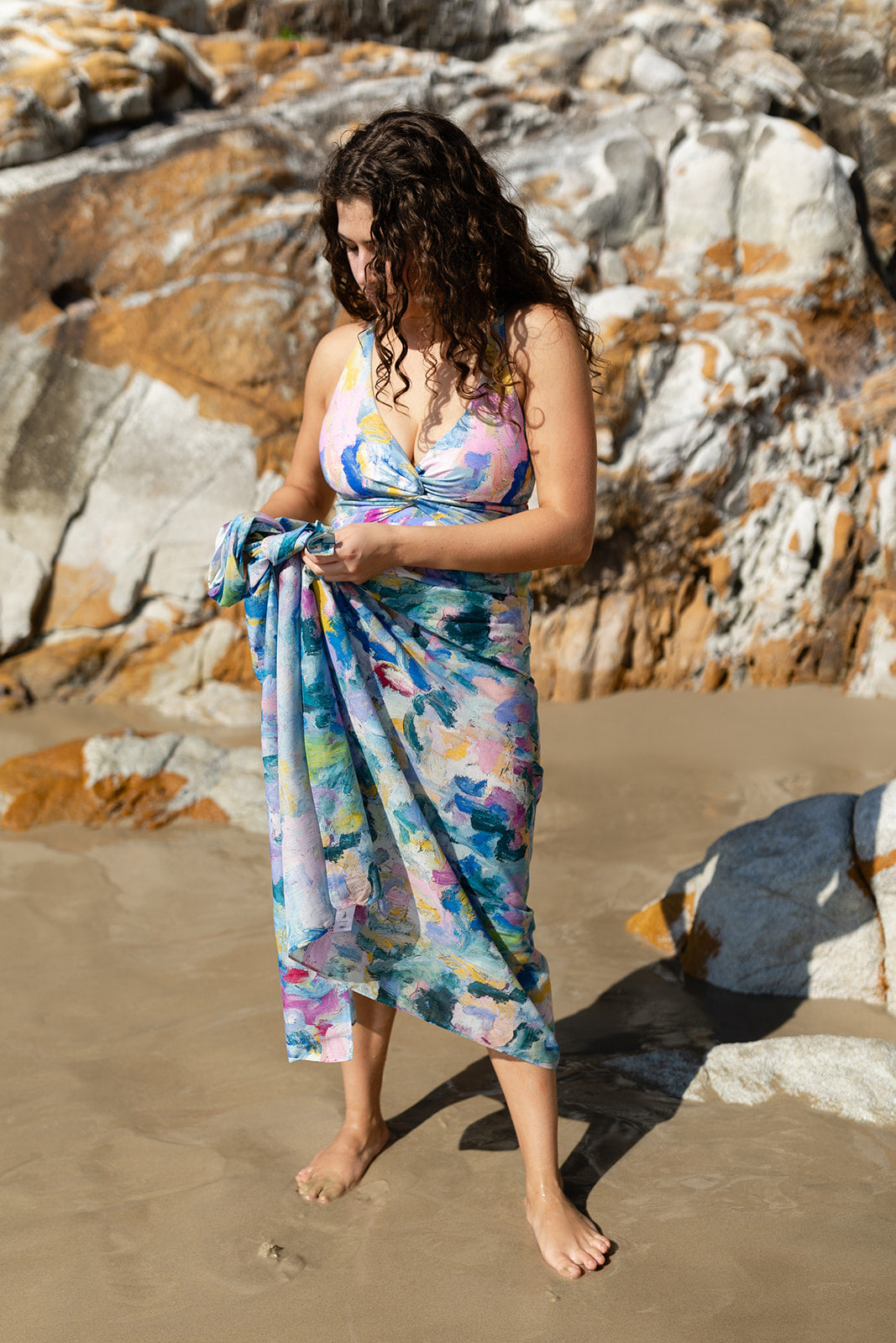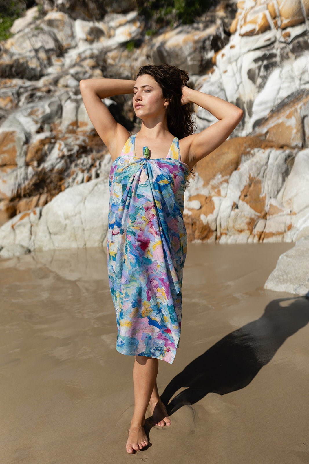 Our light-weight, breathable cotton sarong is the perfect cover-up for the beach or lounging poolside, with many ways to tie and wear. Wear art with our exclusive "Here She Is" print painted by our founder Adele Bevacqua.