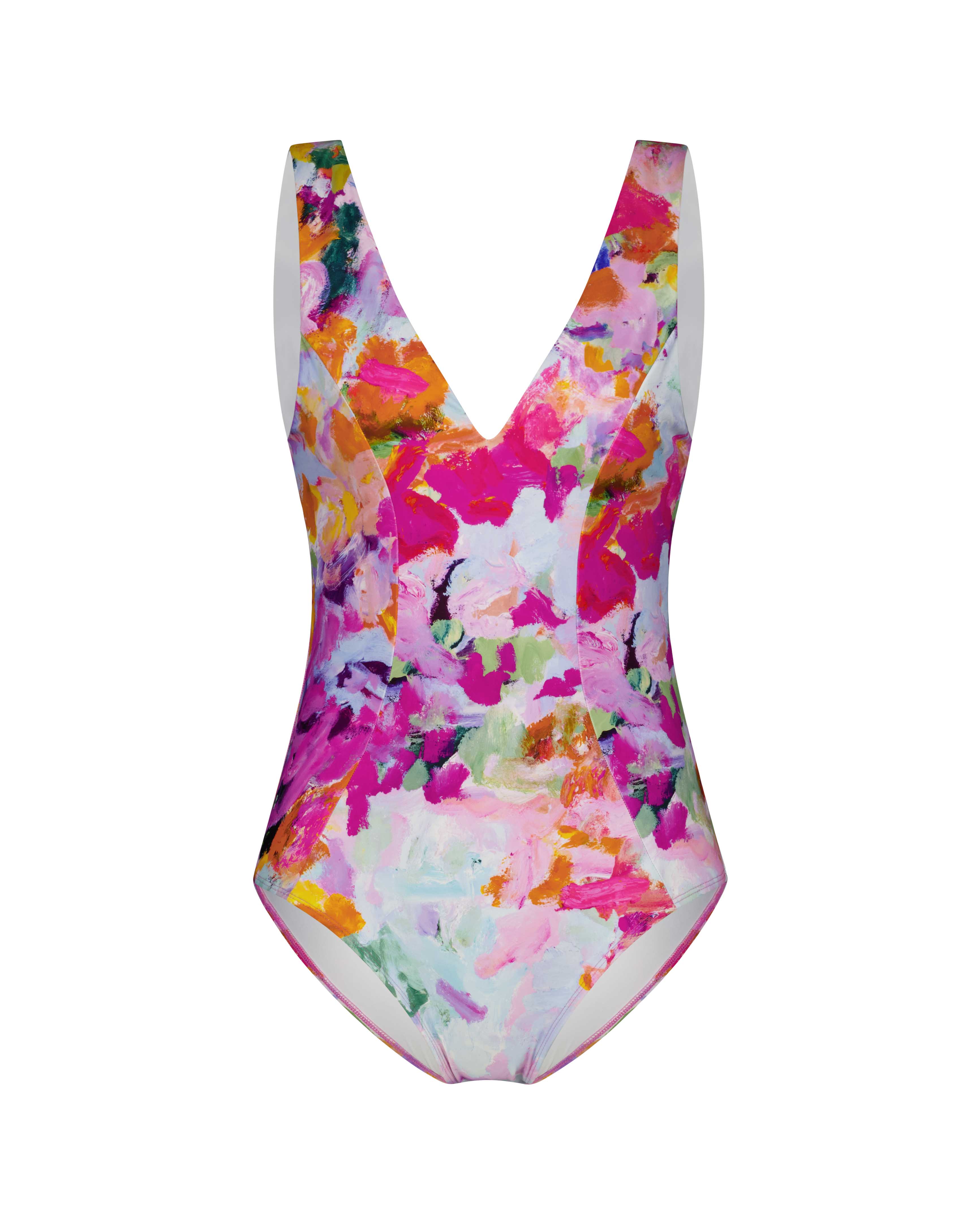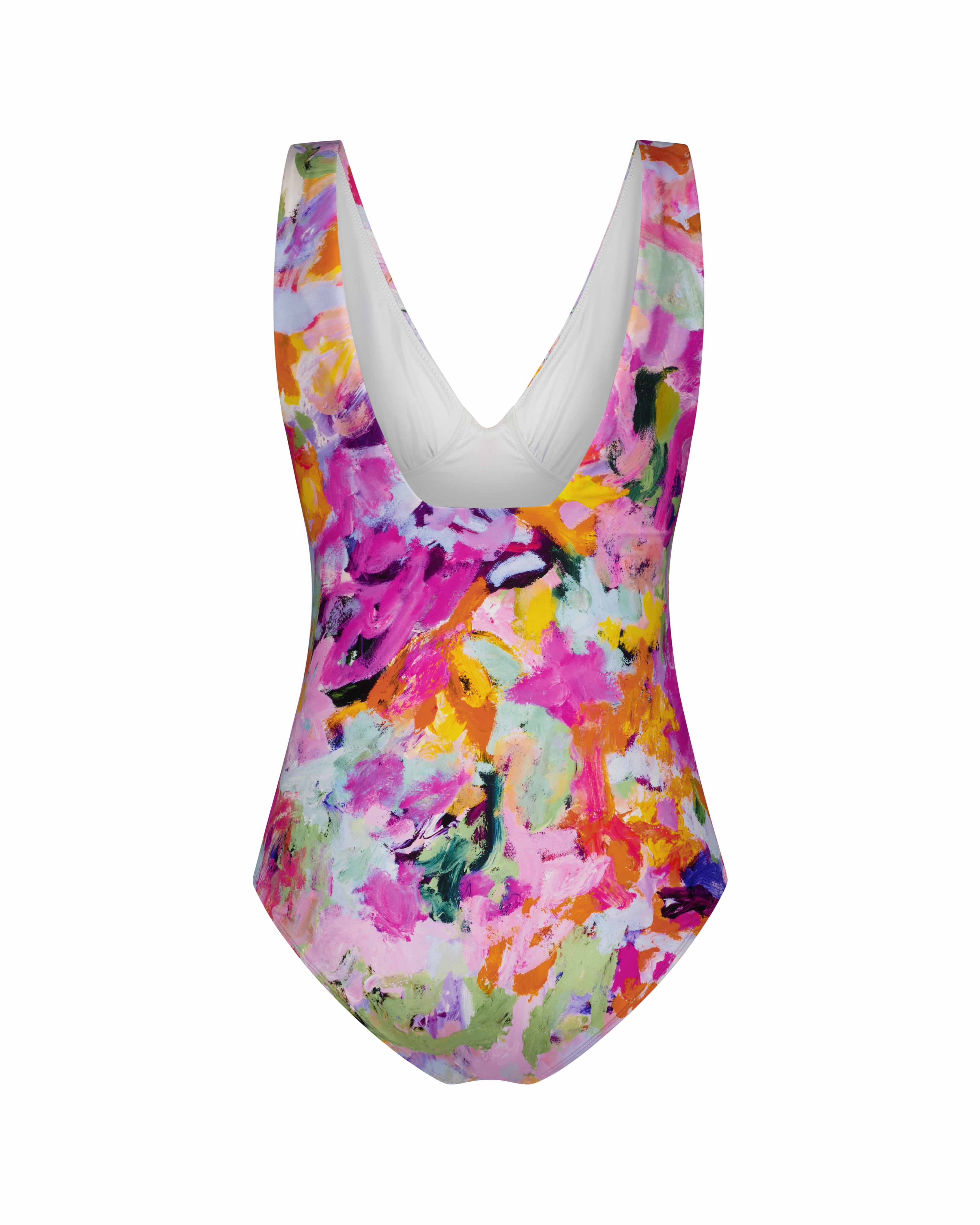 Make a splash in our Scoop Front One Piece Swimwear, crafted from eco-friendly REPREVE® fabric and featuring the exclusive hand painted art piece titled "Shining bright" by Adele Bevacqua.
