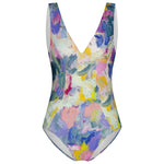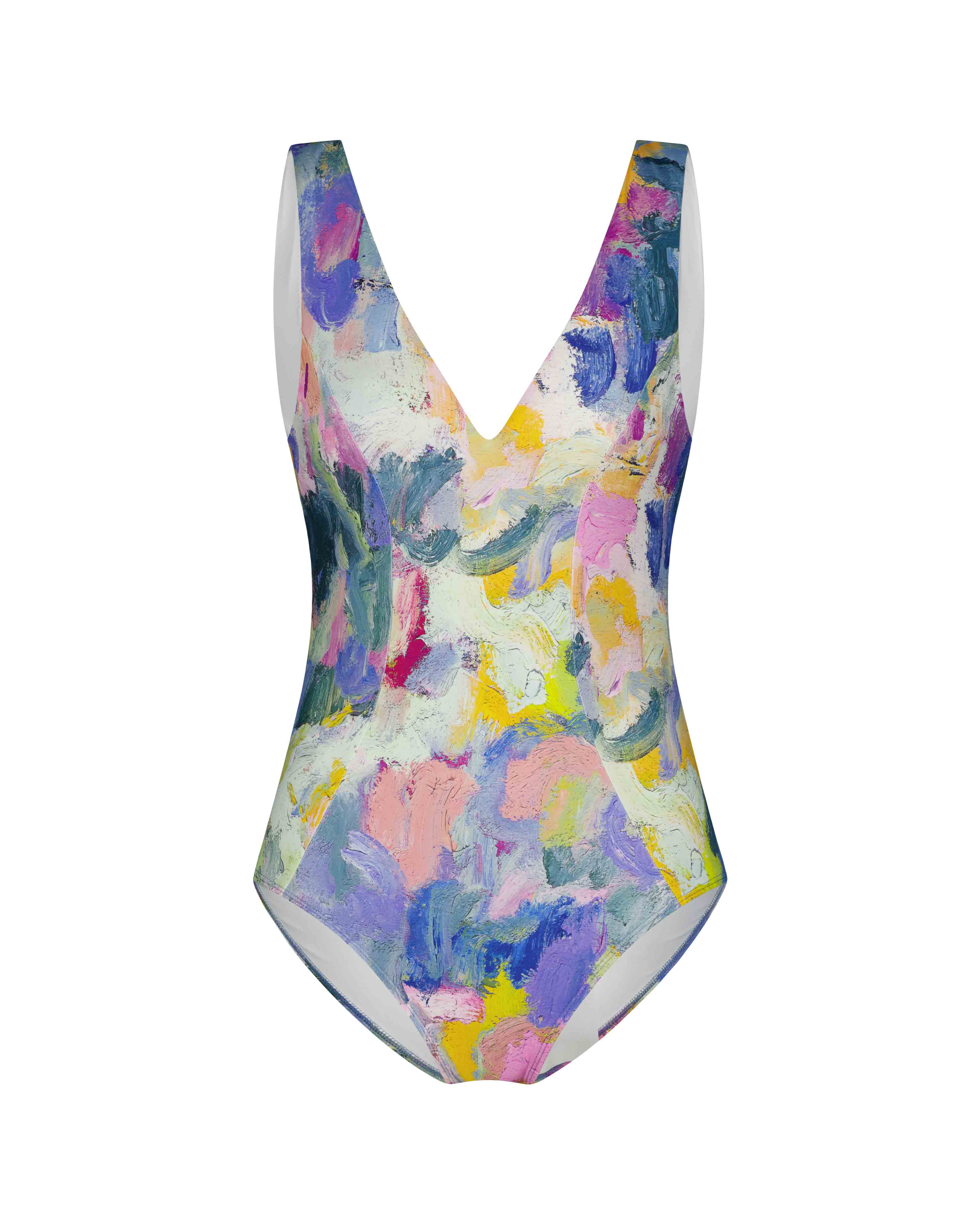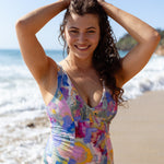 Make a splash in our Scoop Front One Piece Swimwear, crafted from eco-friendly REPREVE® fabric and featuring the exclusive hand painted art piece titled "Here She Is" by Adele Bevacqua.