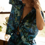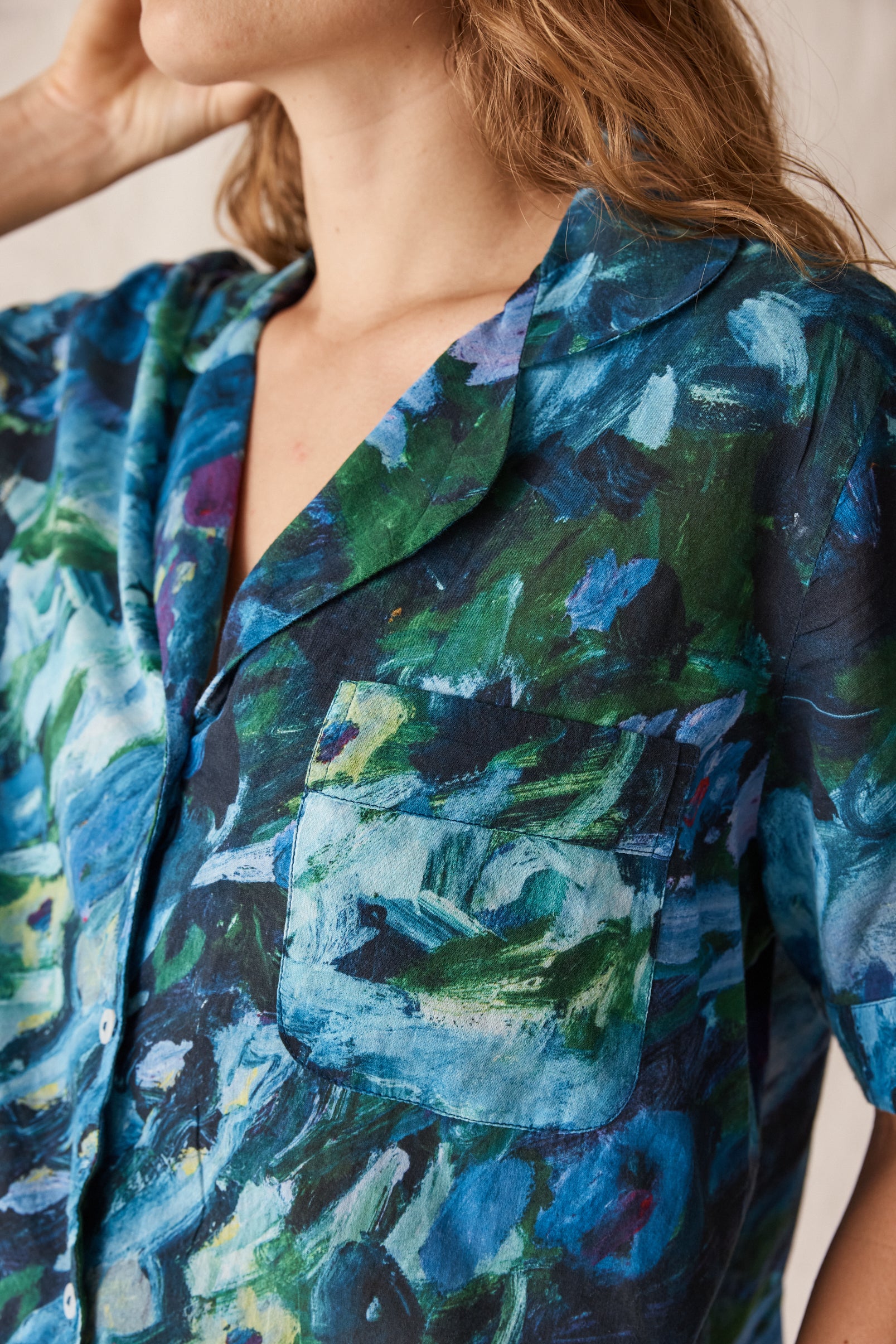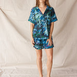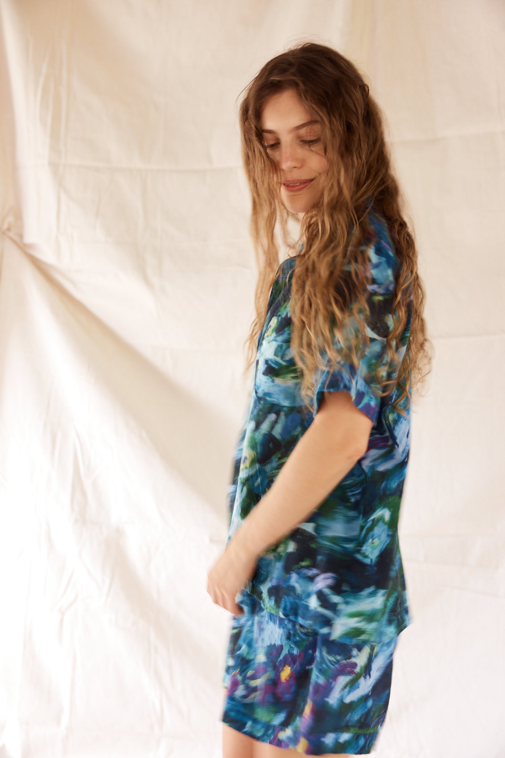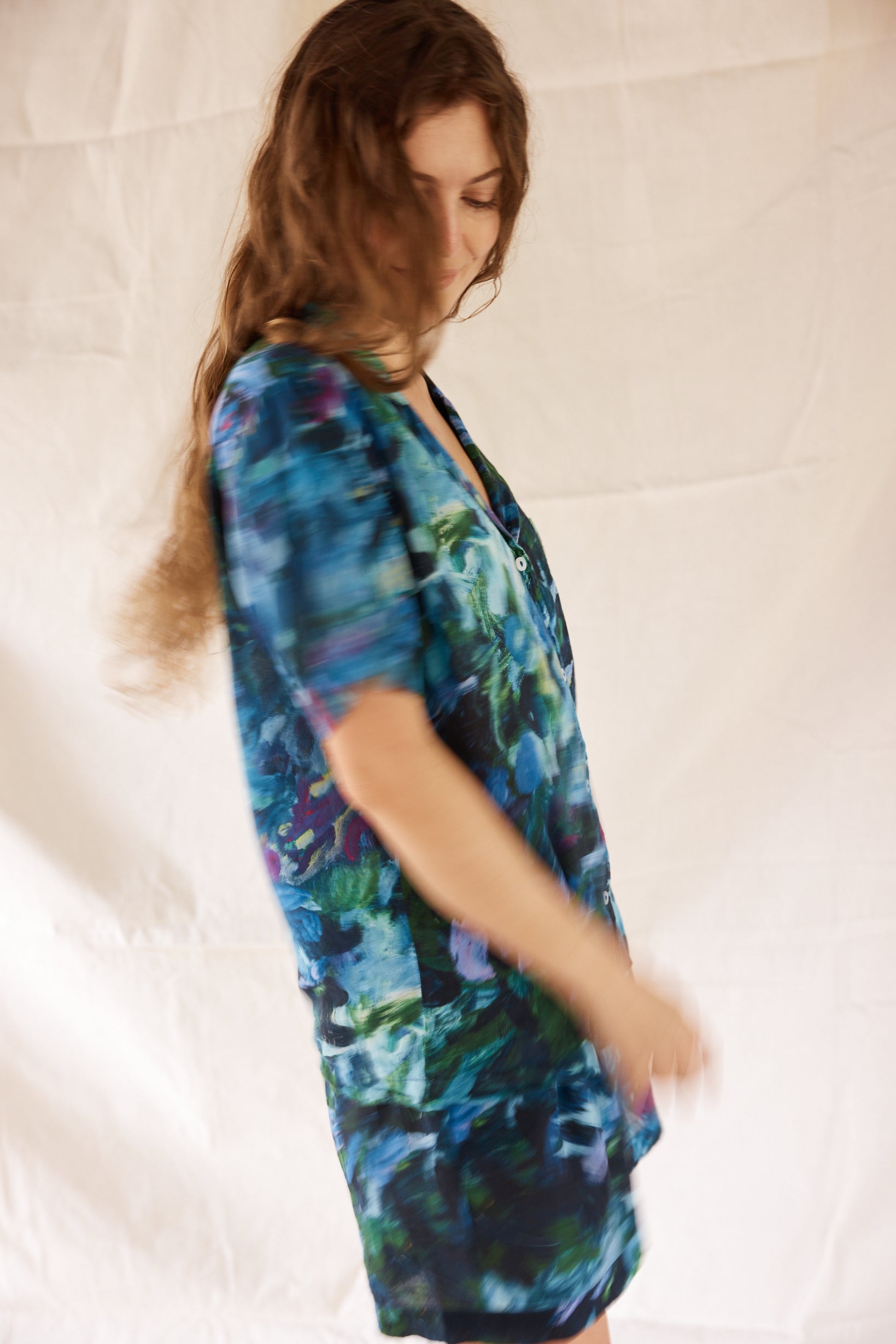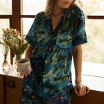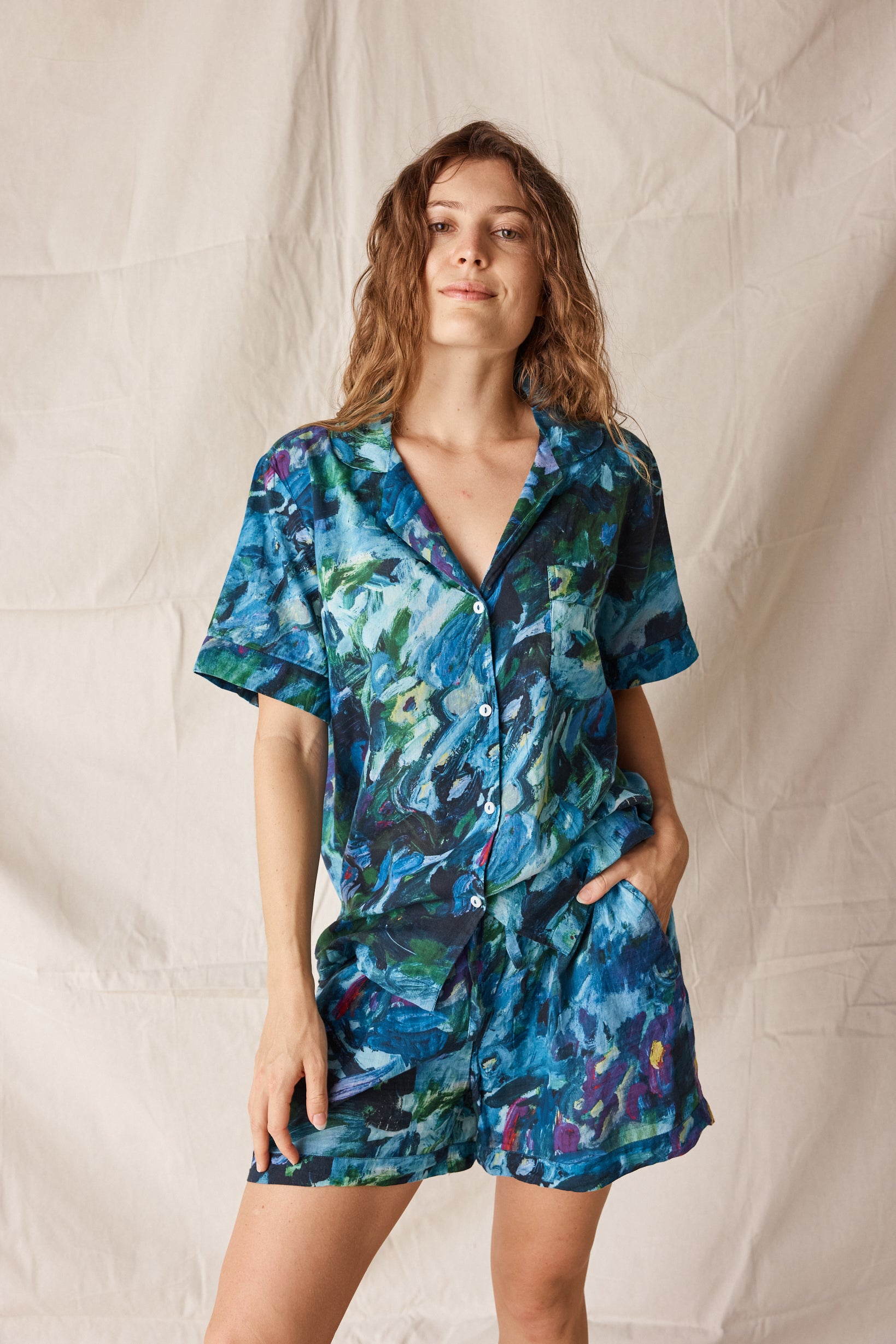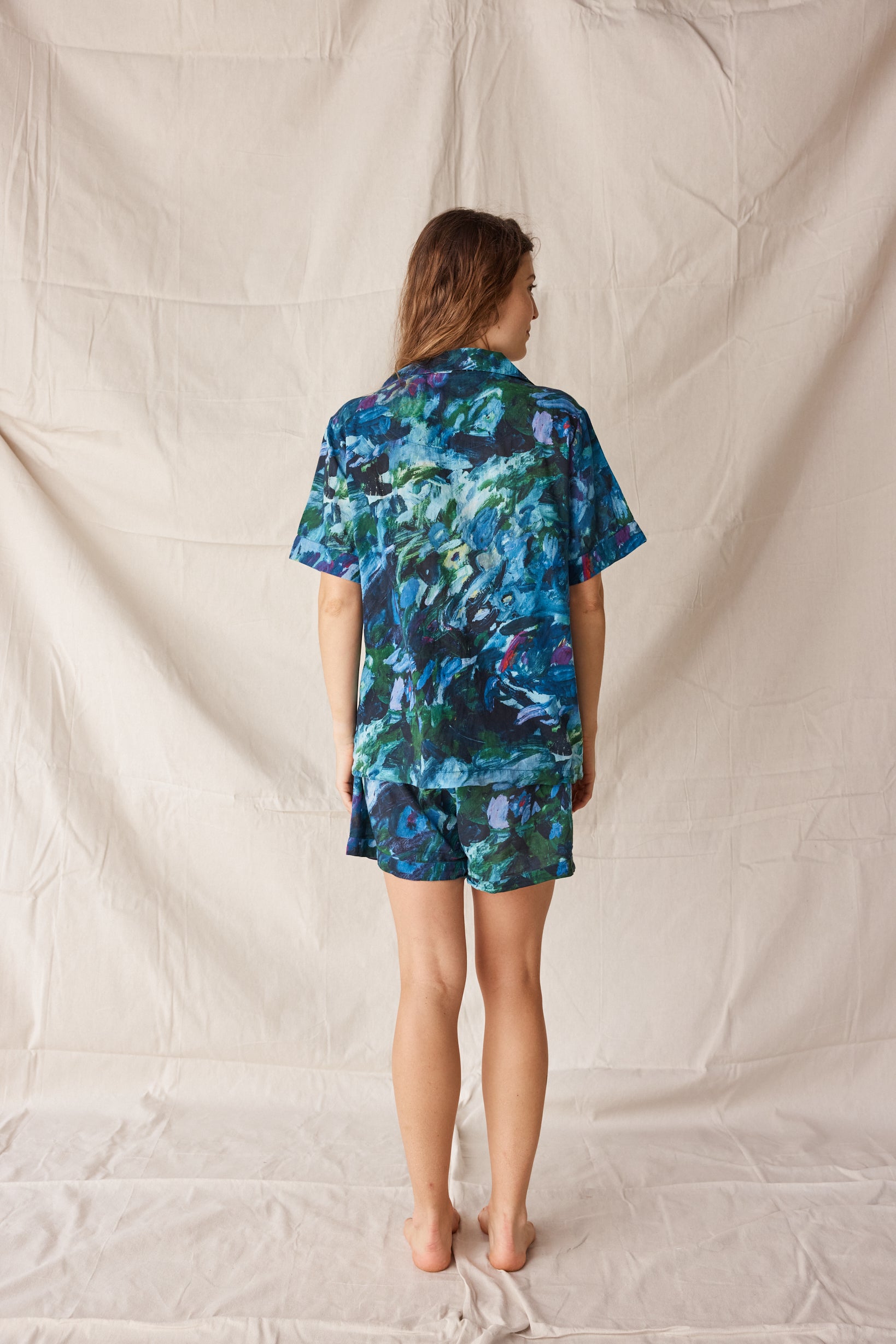 The Short Sleep Set in Aurora blends comfort with creativity - a relaxed short-sleeve button-up and matching drawstring shorts with pockets, crafted from lightweight, breathable cotton. The exclusive Aurora print, taken from an original artwork by Adele Bevacqua, capturing colour with an artists eye.