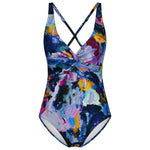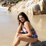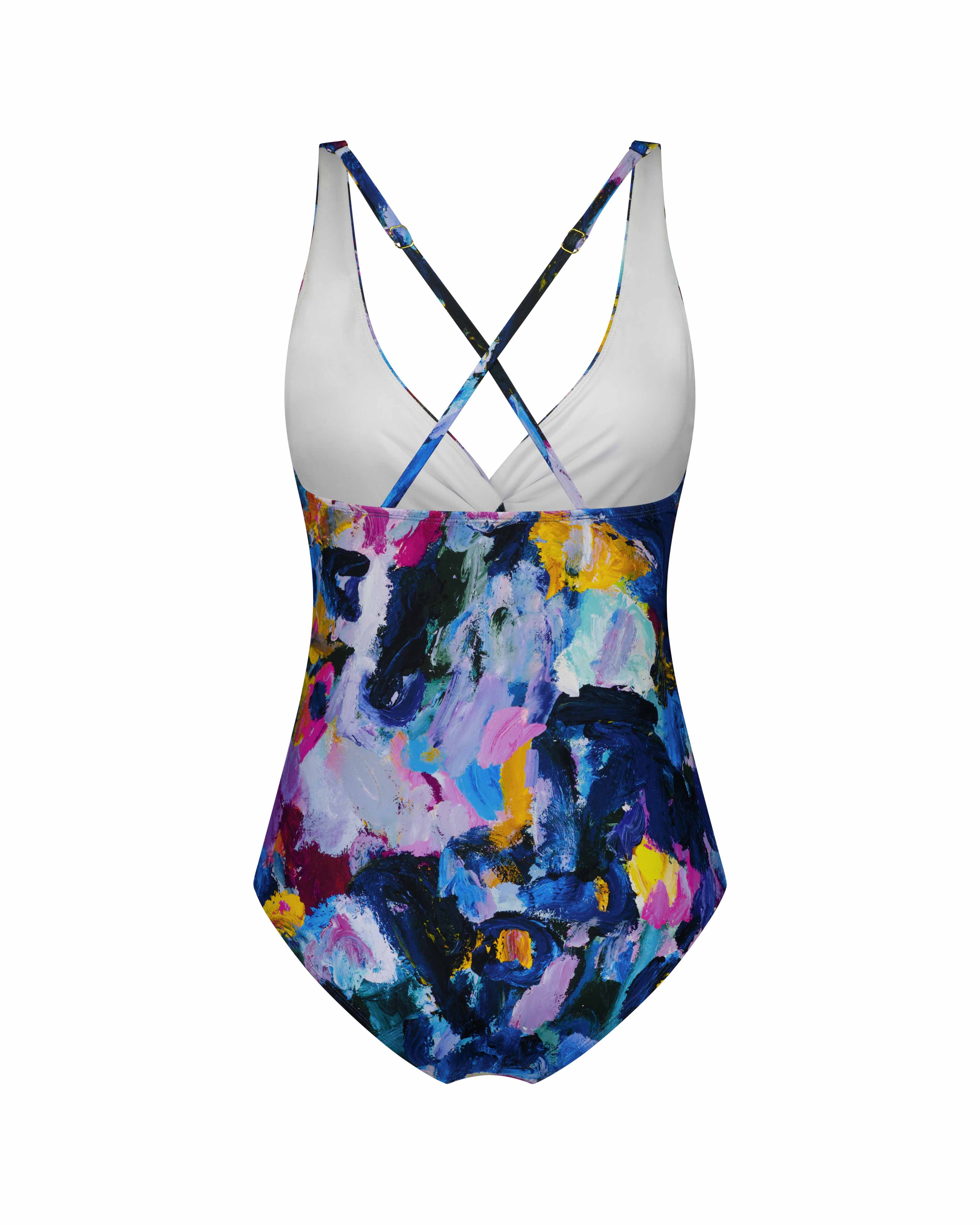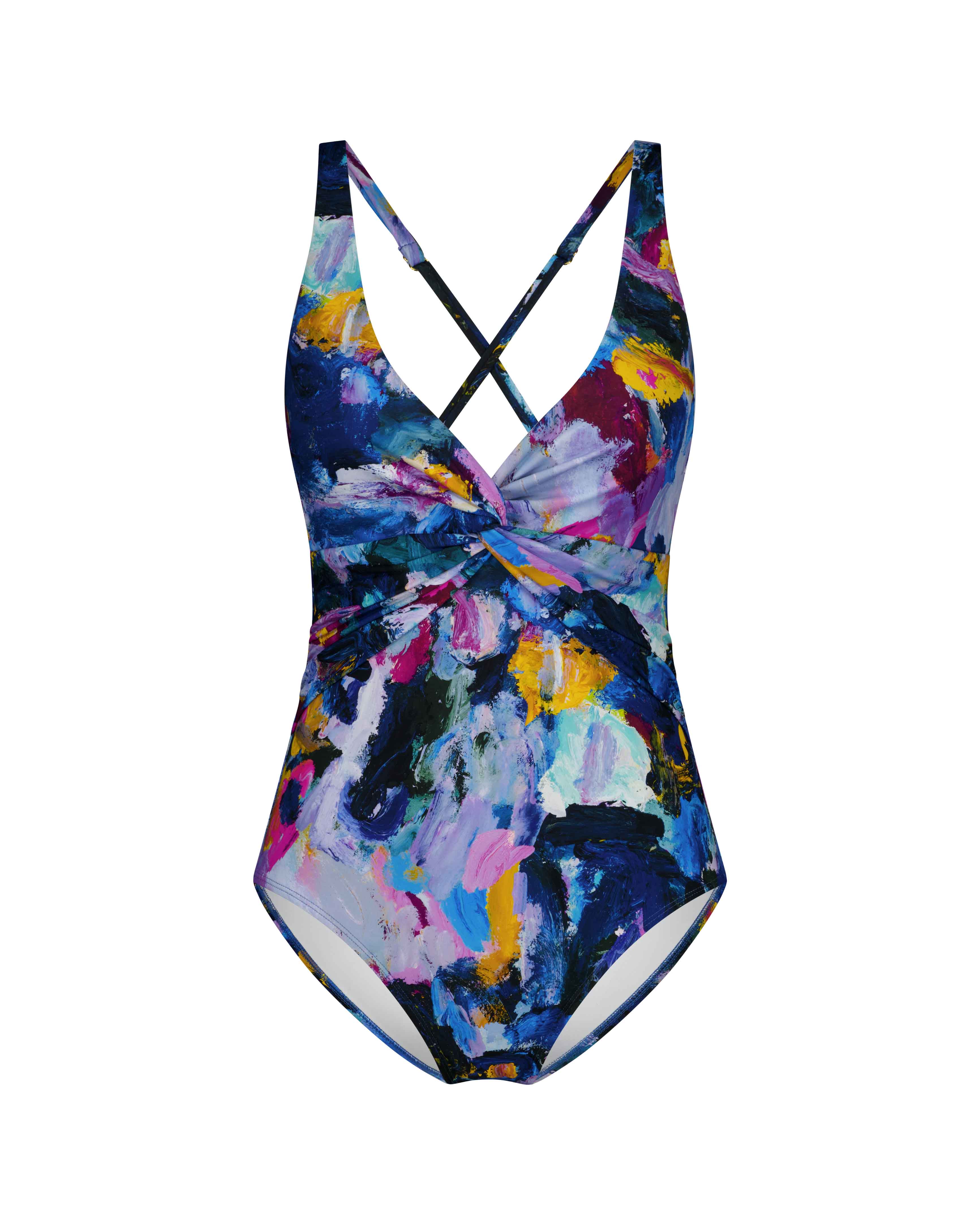 Make a splash in our Twist-Front One Piece Swimwear, crafted from eco-friendly REPREVE® fabric and featuring the the exclusive hand painted art piece titled "Vase of Wonder" by Adele Bevacqua.